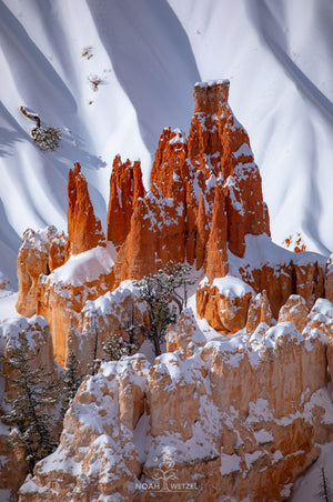 Spires and hoodoos grace a backdrop of snow covered spines creating a surreal desert landscape within Bryce Canyon National Park, Utah.